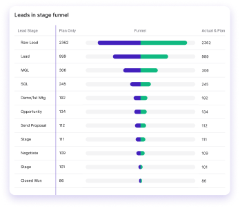 The platform ties revenue goals to functional responsibilities and activity-level KPIs. Everyone sees the same targets, the same assumptions, and the same real-time performance diagnostics.
